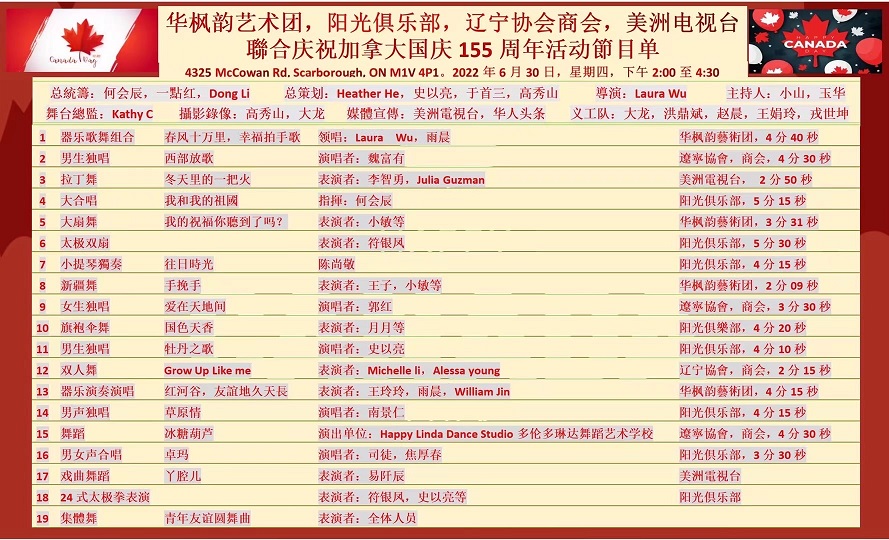 2022年6月30号,为庆祝加拿大建国155周年, 由加拿大华枫韵艺术团、加拿大辽宁协会、辽宁商会、加拿大阳光俱乐部、加拿大美洲电视台等联合举办的文娱活动,在Milliken体育馆隆重举行。